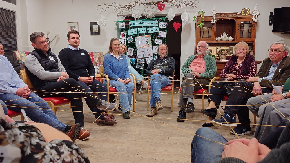 Vernetzung in der Firnhaberau - bei der Vorstellung des neuen Flyers haben die Vertreter der Vereine und Organisationen die Fäden in der Hand (Foto: Andreas Berndt)„Wir wollen den neu Zugezogenen eine einfachere Integration in das soziale Leben in der Firnhaberau ermöglichen“, erklärt Gitti Kurz, die als Leiterin des Mehrgenerationentreffpunktes das Projekt in die Hand genommen hat – und ergänzt: „Aber auch die alteingesessenen Firnhaberauer werden Angebote entdecken, die sie noch nicht kannten“.